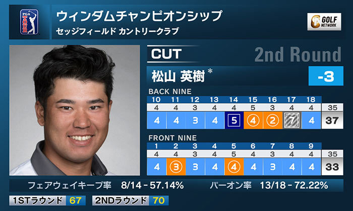 米男子ツアーのレギュラーツアー最終戦「ウィンダムチャンピオンシップ」は2日、米ノースカロライナ州のセッジフィールドカントリークラブ(7,127ヤード・パー70)で第2ラウンドが行われ、松山英樹は4バーディ、1ボギー、1トリプルボギーの「70」とスコアを伸ばせず、通算3アンダー84位タイで予選落ちとなっている。