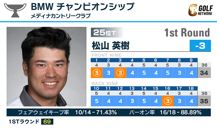 米男子ツアーのFedExカッププレーオフシリーズ第2戦「BMWチャンピオンシップ」は15日、米イリノイ州のメディナカントリークラブ(パー72)で第1ラウンドが行われた。松山英樹は3バーディ、ノーボギーの3アンダー69を記録し、首位と4打差25位タイで初日を終えた。