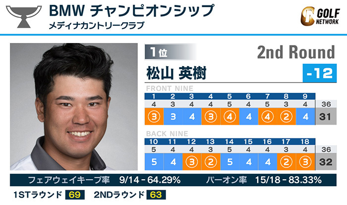 米男子ツアーのFedExカッププレーオフシリーズ第2戦「BMWチャンピオンシップ」は16日、米イリノイ州のメディナカントリークラブ(パー72)で第2ラウンドが行われ、松山英樹はコースレコードとなる9バーディ、ノーボギーの「63」を叩き出し、通算12アンダー単独首位に浮上している。