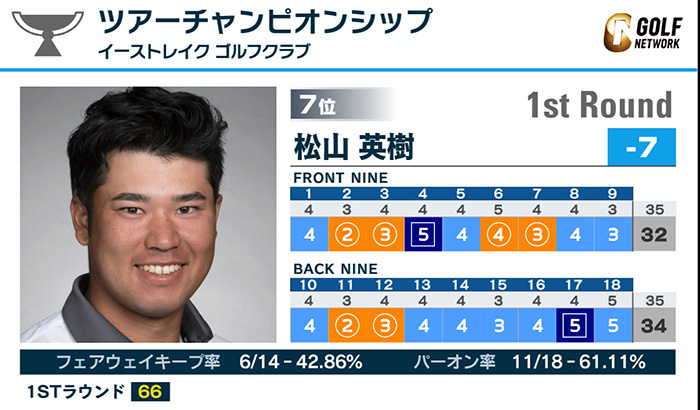 米男子ツアーのプレーオフシリーズ最終戦「ツアーチャンピオンシップ」は22日、米ジョージア州のイーストレイクゴルフクラブ(パー70)で第1ラウンドが行われ、3アンダーから出た松山英樹は6バーディ、2ボギーの「66」で回り、首位と3打差単独7位と好位置につけている。