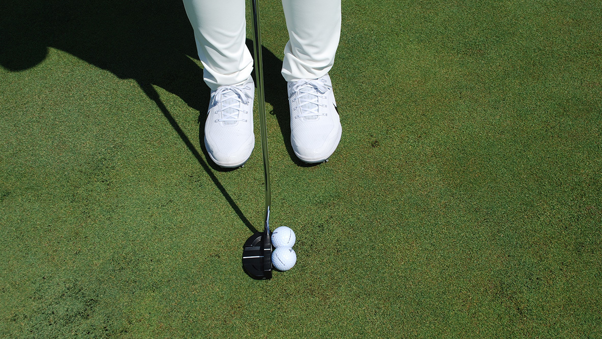 このドリルは、パターのフェースの少し下目でボールを打つための練習です。下目(芯に近いところ)に当てたほうが、ボールの回転が良くなり、その分、芝目に負けないからカップインの確率が高くなるからです。「ボールをタテに2つ並べて同時に打つ」