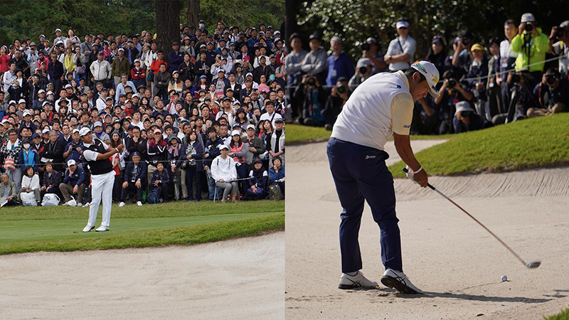 右の写真は、ZOZOチャンピオンシップ最終ラウンド18番パー5で、タイガーを2打差で追う松山選手が2オンを狙う瞬間。鬼気迫る迫力でした。