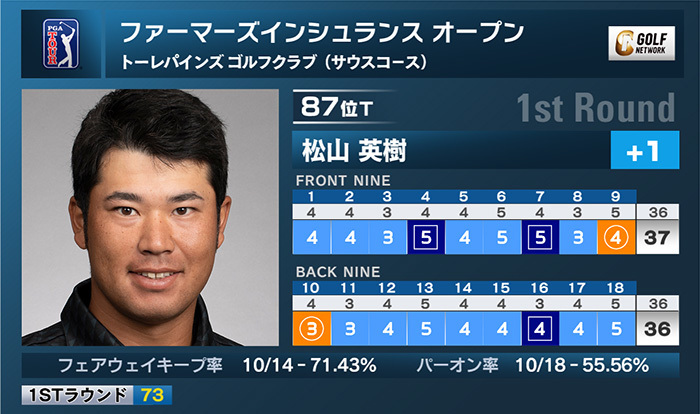 米男子ツアーのファーマーズインシュランスオープンは23日、米カリフォルニア州のトーレパインズゴルフコースのサウスコース(SC)とノースコース(NC)で第1ラウンドが終了。松山英樹はサウスコースを2バーディ、3ボギーの「73」でプレーし、1オーバー87位タイ発進となった。