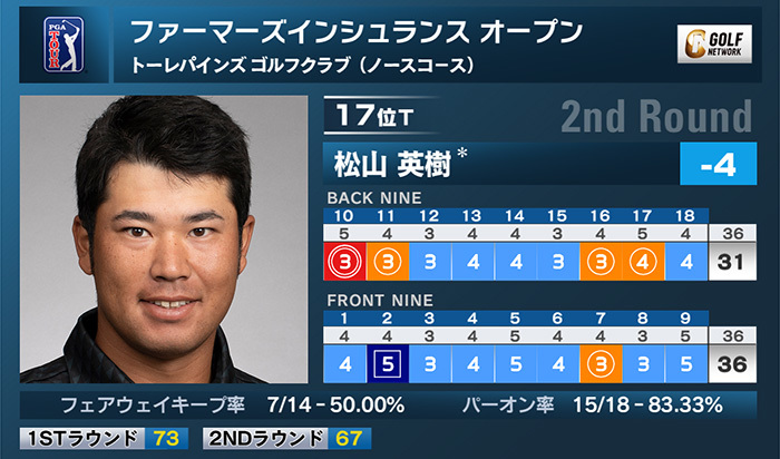 米男子ツアーのファーマーズインシュランスオープンは24日、米カリフォルニア州のトーレパインズゴルフコースのサウスコース(SC)とノースコース(NC)で第2ラウンドが行われ、松山英樹はノースコースで1イーグル、4バーディ、1ボギーの「67」で回り、通算4アンダー17位タイで決勝ラウンド進出を決めた。