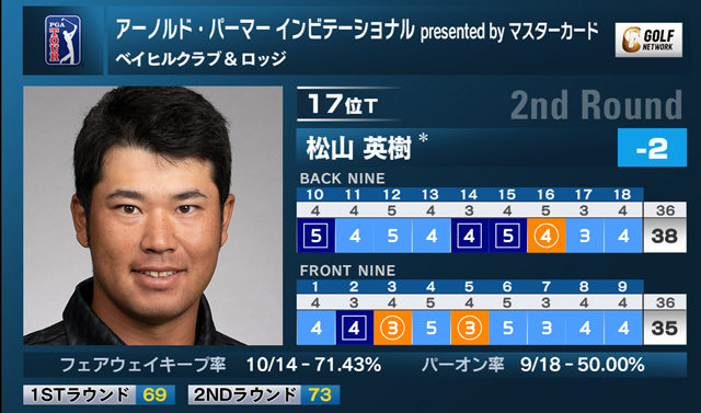 米男子ツアーのアーノルド・パーマーインビテーショナル presented by マスターカードは5日、フロリダ州のベイヒルクラブ&ロッジで第2ラウンドが行われ、難しいシチュエーションのなか松山英樹は3バーディ、4ボギーの「73」で回り、通算2アンダー17位タイで決勝ラウンドへ進む。