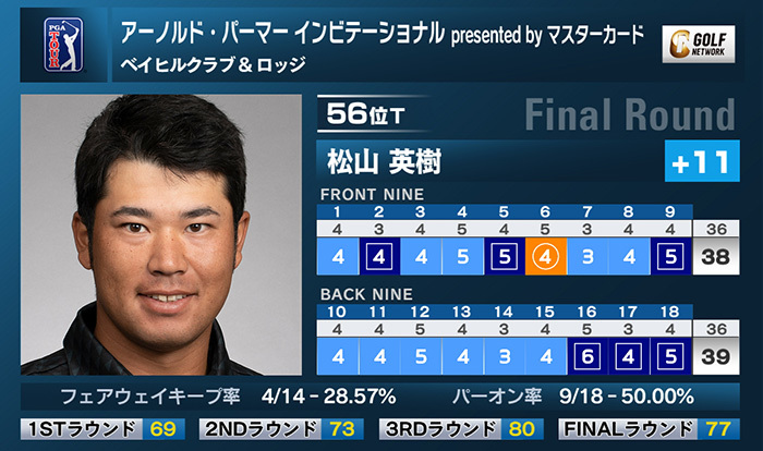 米男子ツアーのアーノルド・パーマーインビテーショナル presented by マスターカードは8日、フロリダ州のベイヒルクラブ&ロッジで最終ラウンドが終了。松山英樹は1バーディ、6ボギーの「77」とスコアを落とし、通算11オーバー56位タイで4日間を終えた。