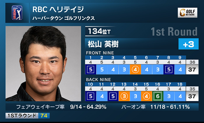 米男子ツアーのRBCヘリテイジは18日、米サウスカロライナ州のハーバータウンゴルフリンクス(7,099ヤード・パー71)で第1ラウンドが行われ、松山英樹は3バーディ、4ボギー、1ダブルボギーの「74」とし、3オーバー134位タイと出遅れた。