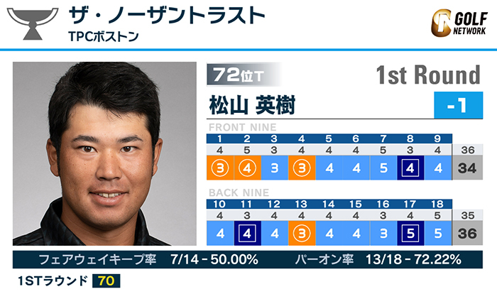 米男子ツアーのプレーオフシリーズ初戦、ザ・ノーザントラストは20日、米マサチューセッツ州のTPCボストンで第1ラウンドが終了。松山英樹は4バーディ、3ボギーの「70」でプレーし、1アンダー72位タイで初日を終えた。