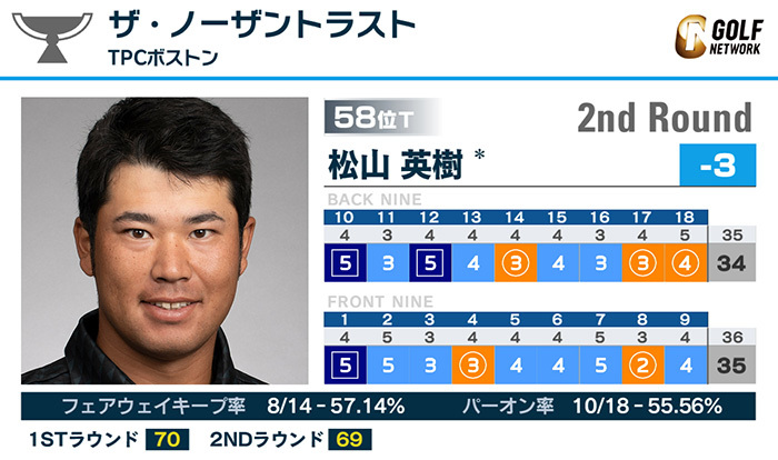 米男子ツアーのプレーオフシリーズ初戦、ザ・ノーザントラストは21日、米マサチューセッツ州のTPCボストンで第2ラウンドが行われ、松山英樹は5バーディ、3ボギーの「69」で回り、通算3アンダー58位タイ。後半8番でバーディを奪うなどカットライン上で予選を通過した。
