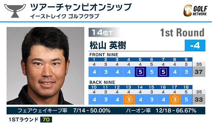 米男子ツアーのプレーオフシリーズ最終戦「ツアーチャンピオンシップ」は4日、米ジョージア州のイースト・レイクゴルフクラブ(7,319ヤード・パー70)で第1ラウンドが行われ、4アンダーからスタートした松山英樹は、2バーディ、2ボギーの「70」で回り、通算4アンダー14位タイにつけている。