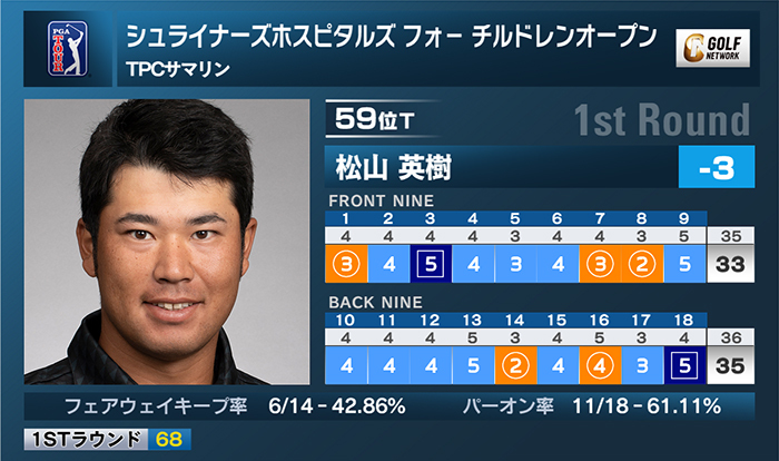 8日、米男子ツアーのシュライナーズホスピタル for チルドレンオープン(米ネバダ州/TPCサマーリン)は第1ラウンドが終了。松山英樹は「68」で回り、トップと6打差の3アンダー59位タイで2日目を迎える。