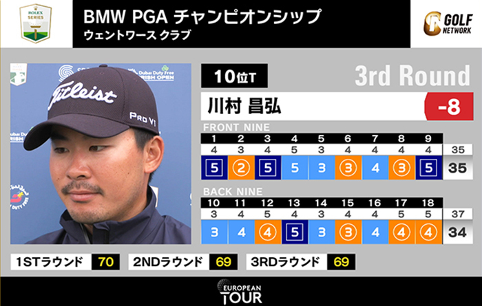 欧州男子ツアーのロレックスシリーズ第3戦、BMW PGAチャンピオンシップは10日、英国のウェントワースクラブ(7,267ヤード)で第3ラウンドが終了。川村昌弘は7バーディ、4ボギーの「69」で回り、トップと6打差の通算8アンダー10位タイで最終日を迎える。