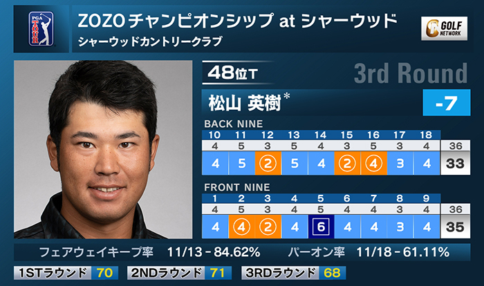 米男子ツアーのZOZOチャンピオンシップ at シャーウッドは24日、米カリフォルニア州のシャーウッドカントリークラブで第3ラウンドが終了。松山英樹は5バーディ、1ボギーの「68」で回り、通算7アンダー48位タイで最終日を迎える。