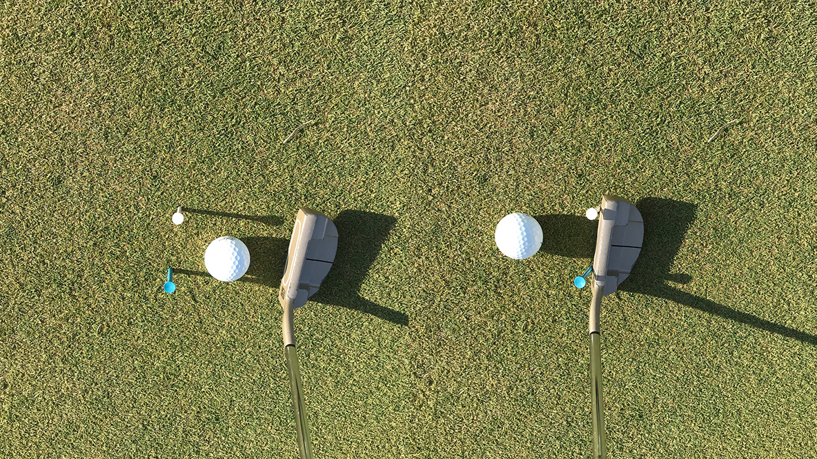 2本のティーがあることによってボールを打ったあとヘッドの動きは止まるわけですが、この練習を繰り返すことで自然とパチンと打つ動きが身に付き、手が前に出ていくこともなくなります。
