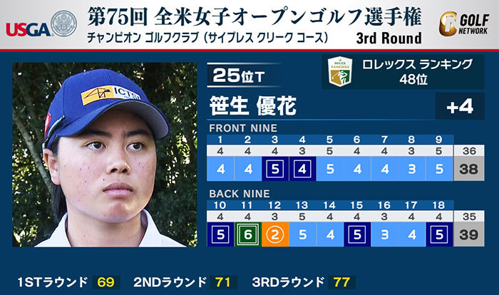 12日、全米女子オープンゴルフ選手権は米テキサス州チャンピオンズゴルフクラブのサイプレスクリークコースで第3ラウンドが終了。笹生優花は1バーディ、5ボギー、1ダブルボギーの「77」で回り、通算4オーバー25位タイで3日目を終えた。