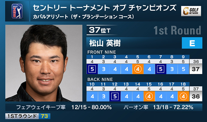 米男子ツアーの2021年初戦、セントリートーナメント オブ チャンピオンズは7日、米ハワイ州のプランテーションコース at カパルアリゾート(7,596ヤード・パー73)で第1ラウンドが行われ、松山英樹は3バーディ、3ボギーの「73」で回り、イーブンパー37位タイ発進となった。