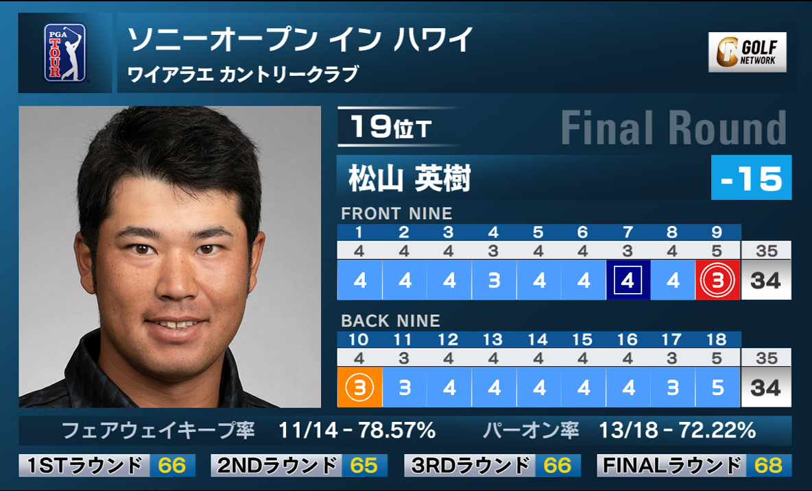 米男子ツアーのソニーオープン イン ハワイは17日、米ハワイ州のワイアラエカントリークラブ(7,044ヤード・パー70)で最終ラウンドが行われ、松山英樹は1イーグル、1バーディ、1ボギーの「68」でプレーし、通算15アンダー19位タイで終えた。