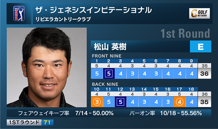 米男子ツアーのザ・ジェネシスインビテーショナルは18日、米カリフォルニア州のザ・リビエラカントリークラブで第1ラウンドが行われ、松山英樹は2バーディ、2ボギーの「71」で回りイーブンパー47位タイ発進となった。
