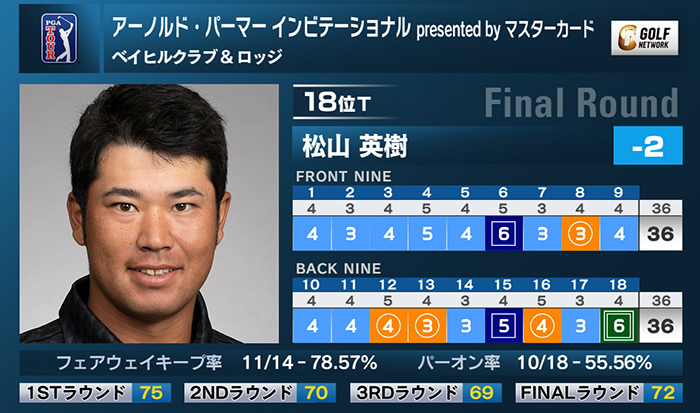 米男子ツアーのアーノルド・パーマーインビテーショナル presented by マスターカードは7日、米フロリダ州のベイヒルクラブ&ロッジ(7,454ヤード・パー72)で最終ラウンドが行われ、松山英樹は4バーディ、2ボギー、1ダブルボギーの「72」で回り、通算2アンダー18位タイで大会を終えた。