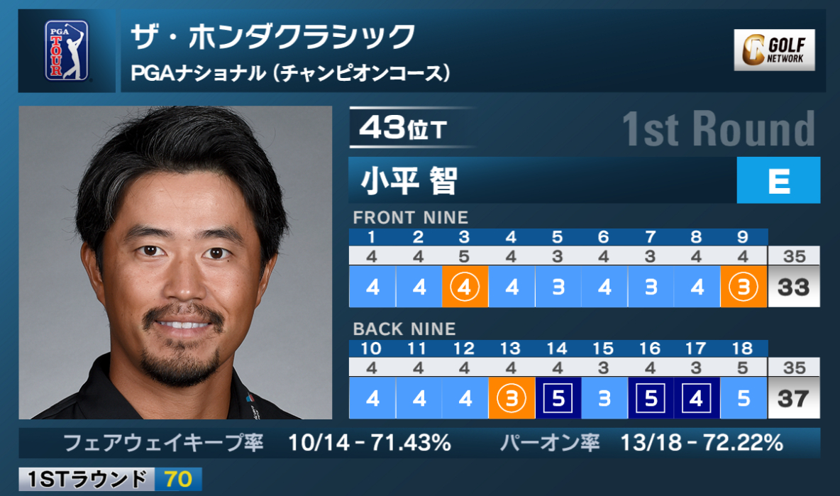 米男子ツアーのザ・ホンダクラシックは18日、米フロリダ州のPGAナショナル(7,125ヤード・パー70)で第1ラウンドが行われ、小平智は3バーディ、3ボギーの「70」で回り、イーブンパー43位タイだった。
