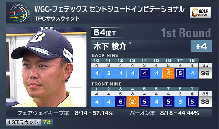 5日、世界選手権シリーズのWGC-FedExセントジュードインビテーショナル(米テネシー州/TPCサウスウィンド)は第1ラウンドが終了。木下稜介は2バーディ、6ボギーの「74」で回り、4オーバー64位タイと出遅れた。
