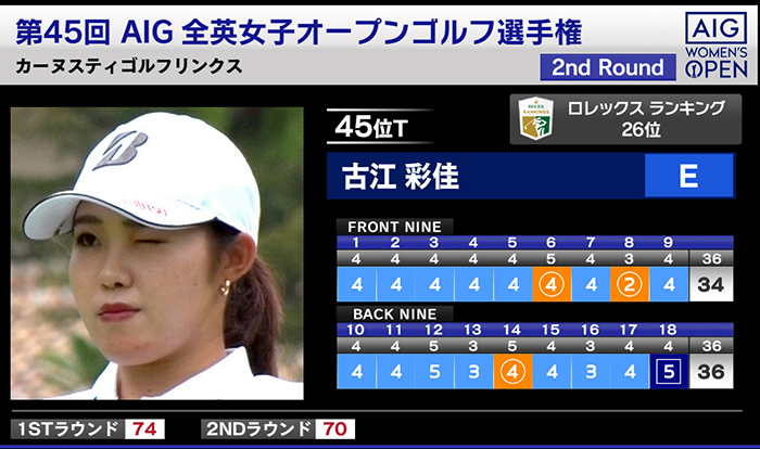 海外女子メジャーのAIG全英女子オープンゴルフ選手権は20日、スコットランドのカーヌスティゴルフリンクス(6,850ヤード・パー72)で第2ラウンドが行われ、古江彩佳は3バーディ、1ボギーの「70」で回り、通算イーブンパー45位タイで3日目へを迎える。
