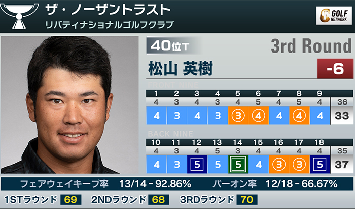 米男子ツアーのプレーオフシリーズ初戦、ザ・ノーザントラストは21日、米ニュージャージー州のリバティーナショナルゴルフクラブ(7,410ヤード・パー71)で第3ラウンドが行われ、松山英樹は5バーディ、2ボギー、1ダブルボギーの「70」で回り、通算6アンダー40位タイで最終日を迎える。