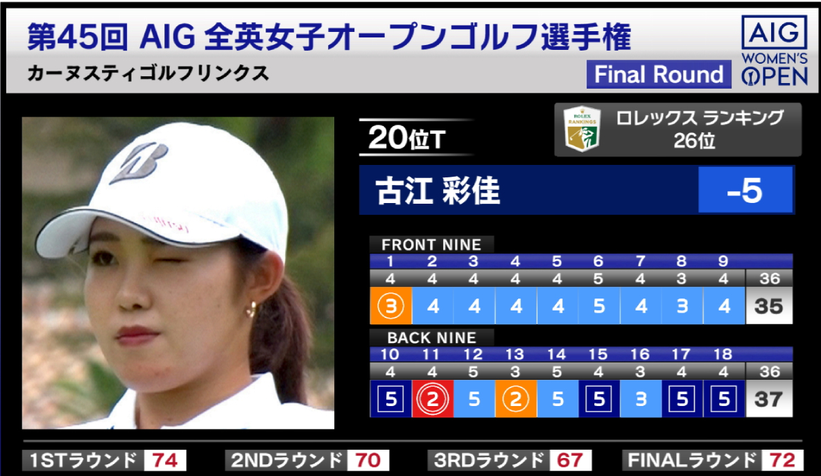 海外女子メジャーのAIG全英女子オープンゴルフ選手権は22日、スコットランドのカーヌスティゴルフリンクスで最終ラウンドが行われ、古江彩佳は1イーグル、2バーディ、4ボギーの「72」で回り、通算5アンダー20位タイだった。