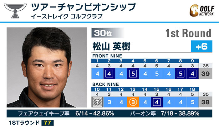 米男子ツアーのプレーオフシリーズ最終戦、ツアーチャンピオンシップが2日、米ジョージア州のイーストレイクゴルフクラブで開幕。1アンダースタートの松山英樹は1バーディ、5ボギー、1トリプルボギーの「77」で回り、6オーバー単独30位発進となった。