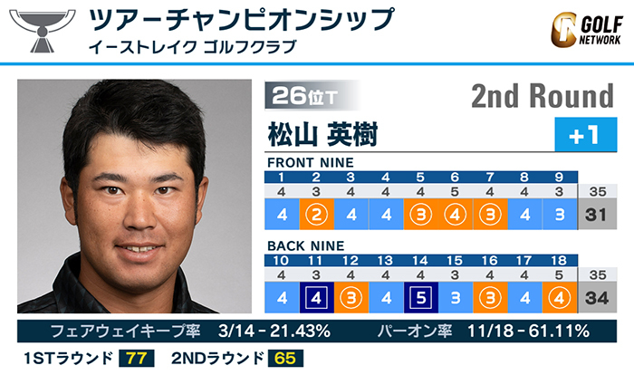 米男子ツアーのプレーオフシリーズ最終戦、ツアーチャンピオンシップは3日、米ジョージア州のイーストレイクゴルフクラブ(7,319ヤード・パー70)で第2ラウンドが行われ、松山英樹は7バーディ、2ボギーの「65」を記録し、通算1オーバー26位タイに浮上した。