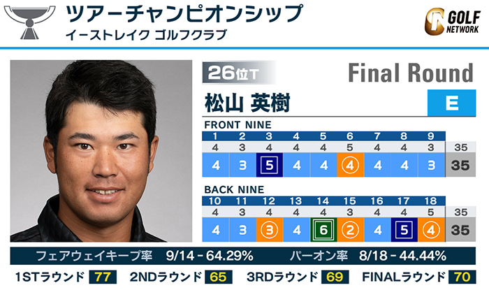 米男子ツアーのプレーオフシリーズ最終戦、ツアーチャンピオンシップは5日、米ジョージア州のイーストレイクゴルフクラブ(7,319ヤード・パー70)で最終ラウンドが行われ、松山英樹は4バーディ、2ボギー、1ダブルボギーの「70」でプレーし、通算イーブンパー26位タイで終えた。