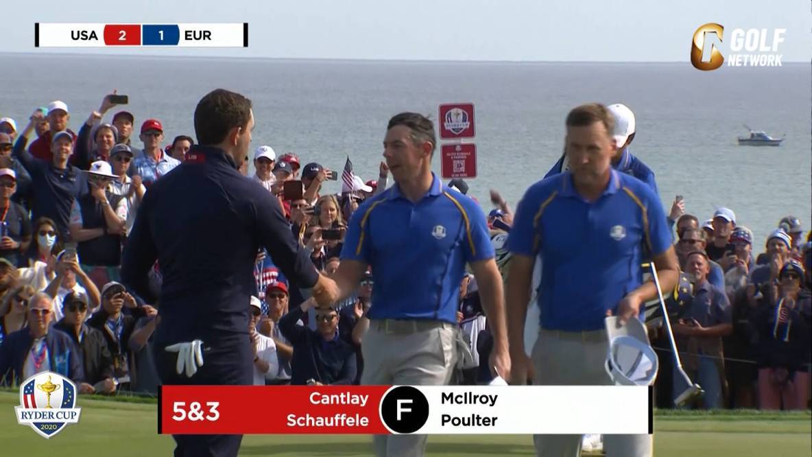 午前のマッチ4は、米国選抜のパトリック・キャントレー&ザンダー・シャウフェレが欧州選抜のローリー・マキロイ(北アイルランド)&イアン・ポールター(英)を5&3で下した。