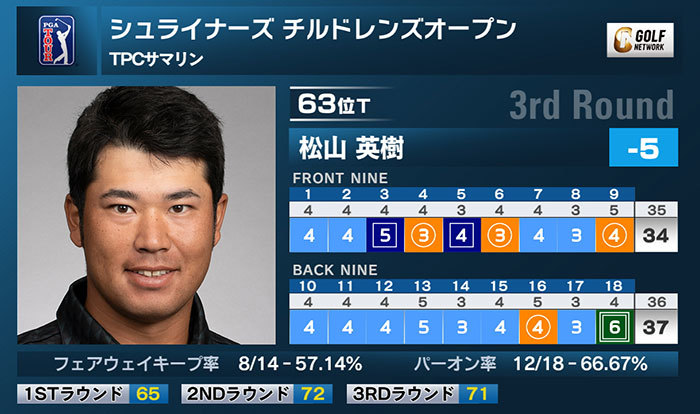 米男子ツアーのシュライナーズチルドレンズオープンは9日、米ネバダ州のTPCサマーリン(7,255ヤード・パー71)で第3ラウンドが終了。松山英樹は4バーディ、2ボギー、1ダブルボギーの「71」とスコアを伸ばせず、通算5アンダー63位タイとなった。
