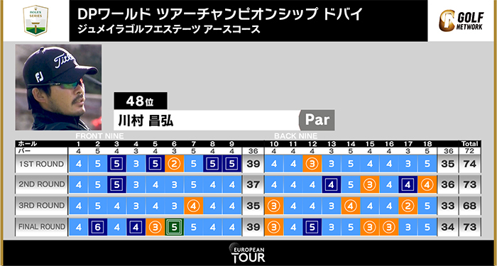 欧州男子ツアーのDPワールドツアーチャンピオンシップ ドバイは21日、アラブ首長国連邦のジュメライゴルフエステート(7,675ヤード・パー72)で最終ラウンドが行われ、川村昌弘は通算イーブンパー単独48位で終えた。