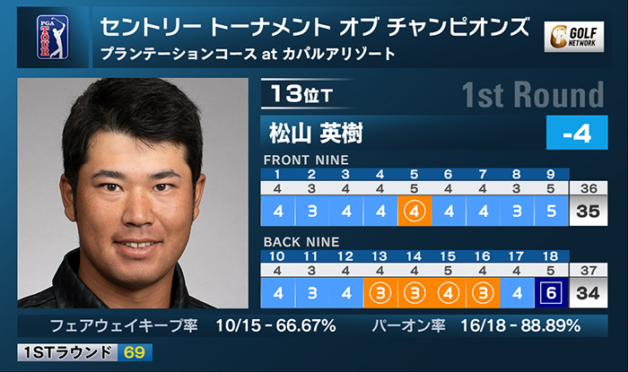 米男子ツアーのセントリートーナメント オブ チャンピオンズは6日、米ハワイ州のプランテーションコース at カパルアリゾート(7,596ヤード・パー73)で第1ラウンドが行われ、松山英樹は5バーディ、1ボギーの「69」で回り、4アンダー13位タイ発進となった。