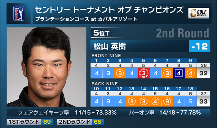 米男子ツアーのセントリートーナメント オブ チャンピオンズは7日、米ハワイ州のプランテーションコース at カパルアリゾート(7,596ヤード・パー73)で第2ラウンドが行われ、松山英樹は1イーグル、7バーディ、1ボギーの「65」で回り、トップと5打差の通算12アンダー5位タイに浮上した。