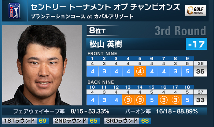 米男子ツアーのセントリートーナメント オブ チャンピオンズは8日、米ハワイ州のプランテーションコース at カパルアリゾート(7,596ヤード・パー73)で第3ラウンドが行われ、松山英樹は5バーディ、ノーボギーの「68」で回り、トップと9打差の通算17アンダー8位タイで最終日を迎える。