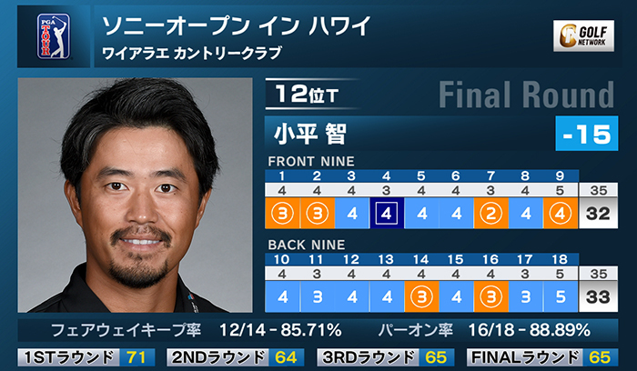 米男子ツアーのソニーオープン イン ハワイは16日、米ハワイ州のワイアラエカントリークラブ(7,044ヤード・パー70)で最終ラウンドが行われ、小平智は6バーディ、1ボギーの「65」で回り、通算15アンダー12位タイで大会を終えた。