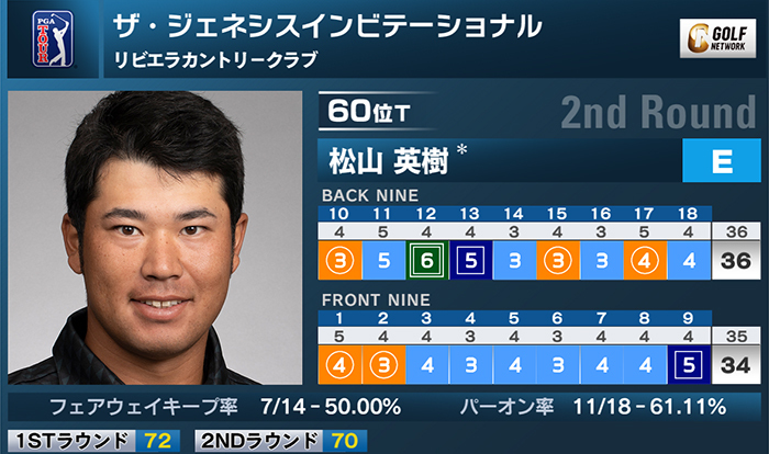 米男子ツアーのザ・ジェネシスインビテーショナルは18日、米カリフォルニア州のザ・リビエラカントリークラブ(7,322ヤード・パー71)で第2ラウンドが行われ、松山英樹は5バーディ、2ボギー、1ダブルボギーの「70」で回り、通算イーブンパー60位タイで予選を通過した。