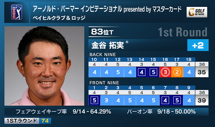 米男子ツアーのアーノルド・パーマーインビテーショナル presented by マスターカードは3日、米フロリダ州のベイヒルクラブ&ロッジ(7,466ヤード・パー72)で第1ラウンドが行われ、金谷拓実は「74」で回り、2オーバー83位タイとなった。