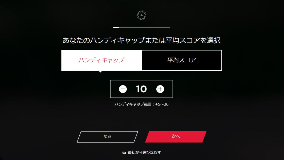 ハンディキャプ(+5~36)または平均スコア(67~107)を選択したら、使用しているピッチングウェッジのロフト角を選ぶか、タイトリストアイアンを使用している場合はそのモデル名を選択する。