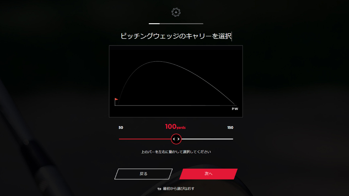 ピッチングウェッジのキャリーを選択(50~150ヤード)すると、セッティングが表示される。基本的には推奨のセッティングを選べば問題ないだろう。