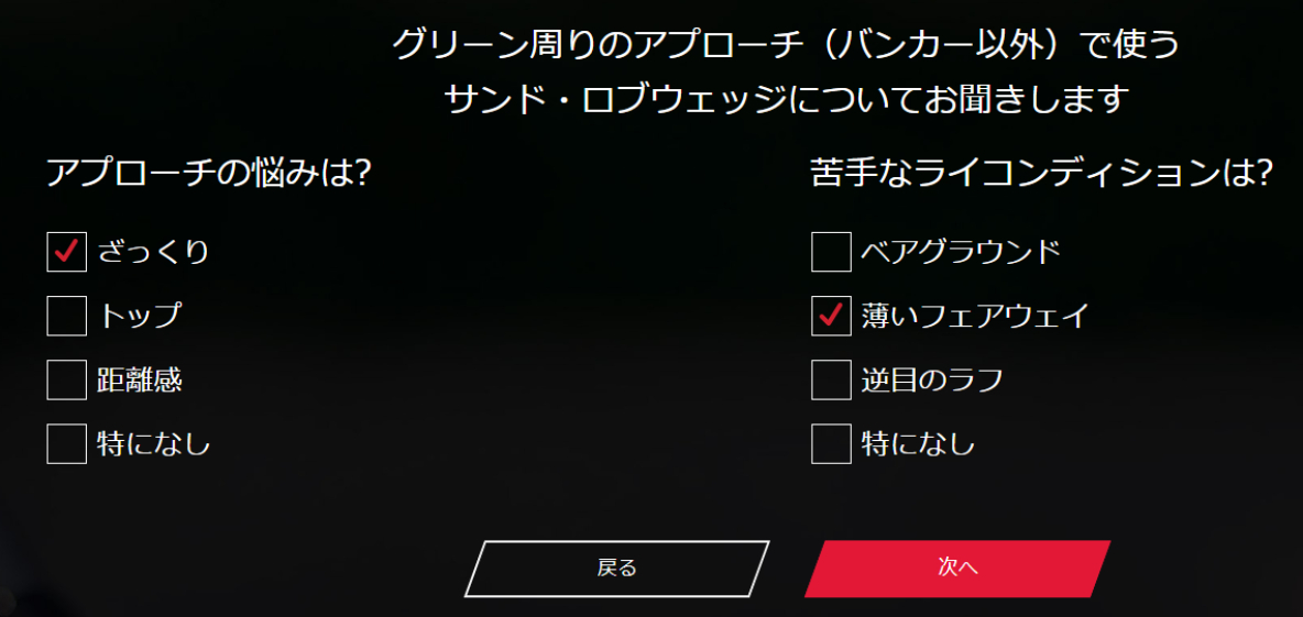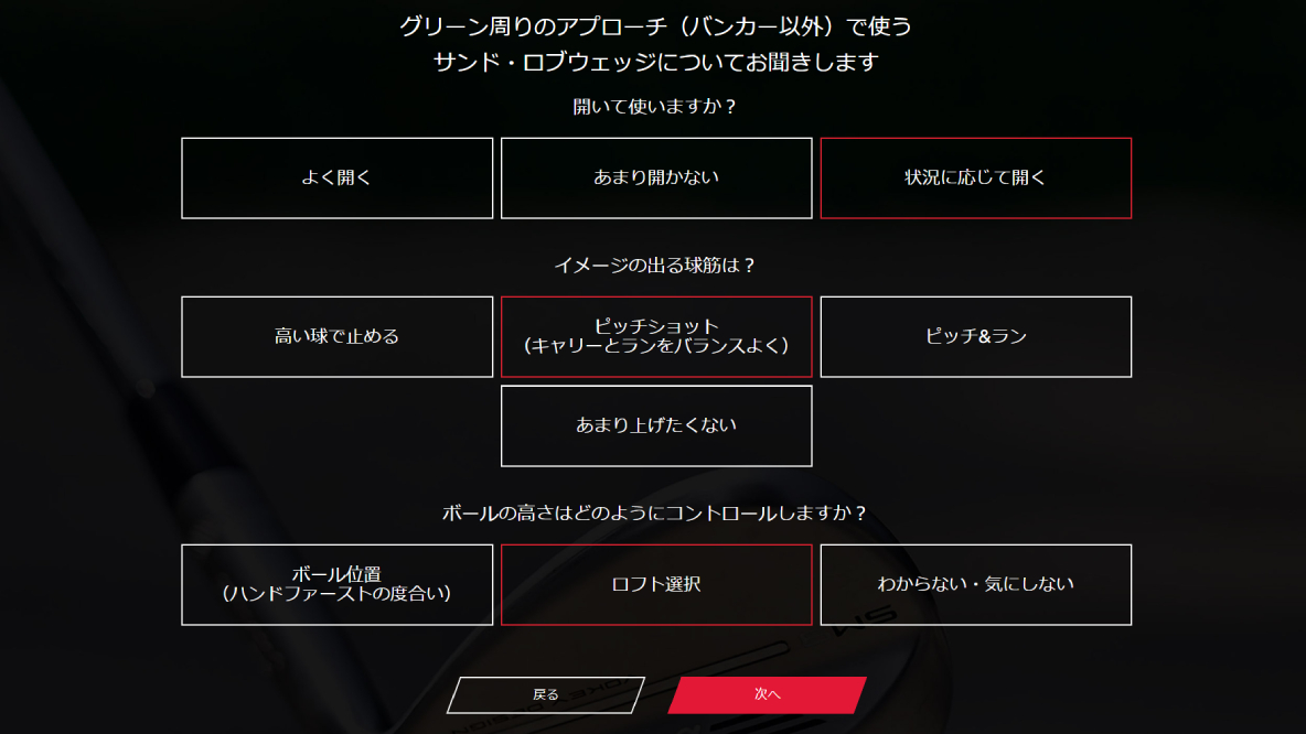 アプローチショット時に使用するウェッジのロフト角を選択したあと、球筋やコントロールの仕方、悩みなど、ウェッジの使用に関する詳細な質問に答える。