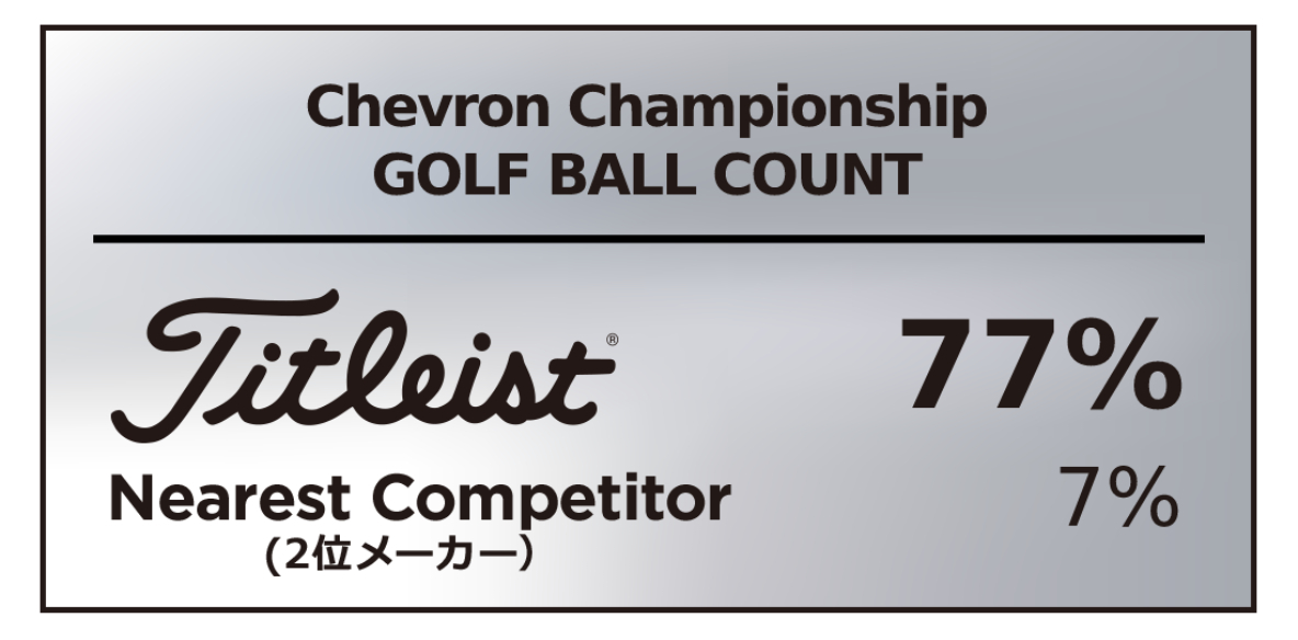 タイトリスト ゴルフボールはシェブロンチャンピオンシップにおいて77%の高い使用率を獲得。これは2位ブランドを10倍以上引き離す圧倒的な信頼性である。
