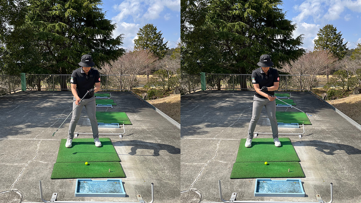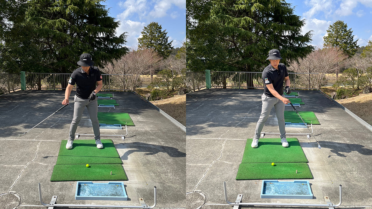 そのあと、普通にクラブを握り、フットワークを使いながらグリップエンドを動かし、ハーフショットでいいのでボールを打ってみてください。