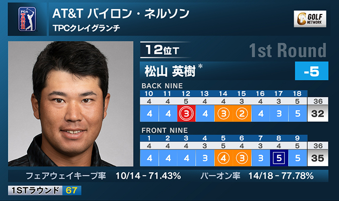 米男子ツアーのAT&Tバイロン・ネルソンは12日、米テキサス州のTPCクレイグランチ(7,468ヤード・パー72)で第1ラウンドが行われ、松山英樹は1イーグル、4バーディ、1ボギーの「67」で回り、5アンダー12位タイと好スタートを切った。