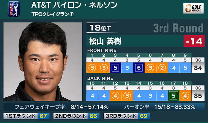 米男子ツアーのAT&Tバイロン・ネルソンは14日、米テキサス州のTPCクレイグランチ(7,468ヤード・パー72)で第3ラウンドが終了。9位タイから出た松山英樹は7バーディ、2ボギー、1ダブルボギーの「69」で回り、通算14アンダー18位タイに後退した。
