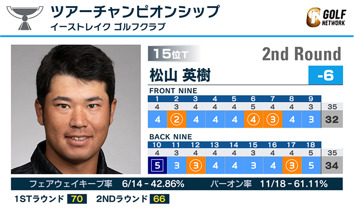 米男子ツアーのプレーオフシリーズ最終戦、ツアーチャンピオンシップは26日、米ジョージア州のイーストレイクゴルフクラブ(7,346ヤード・パー70)で第2ラウンドが行われ、松山英樹は5バーディ、1ボギーの「66」で回り、通算6アンダー15位タイとなった。