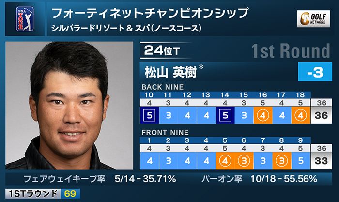 米男子ツアーの2022-23年シーズン開幕戦、フォーティネットチャンピオンシップは15日、米カリフォルニア州のシルバラートリゾート&スパ(7,123ヤード・パー72)で第1ラウンドが行われたが、日没順延が決定。松山英樹は5バーディ、2ボギーの「69」で回り、3アンダー暫定24位タイにつけている。