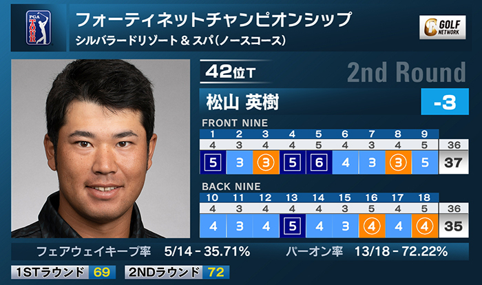 米男子ツアーのフォーティネットチャンピオンシップは16日、米カリフォルニア州のシルバラートリゾート&スパ(7,123ヤード・パー72)で第2ラウンドが行われ、松山英樹は通算3アンダー42位タイで予選を通過した。